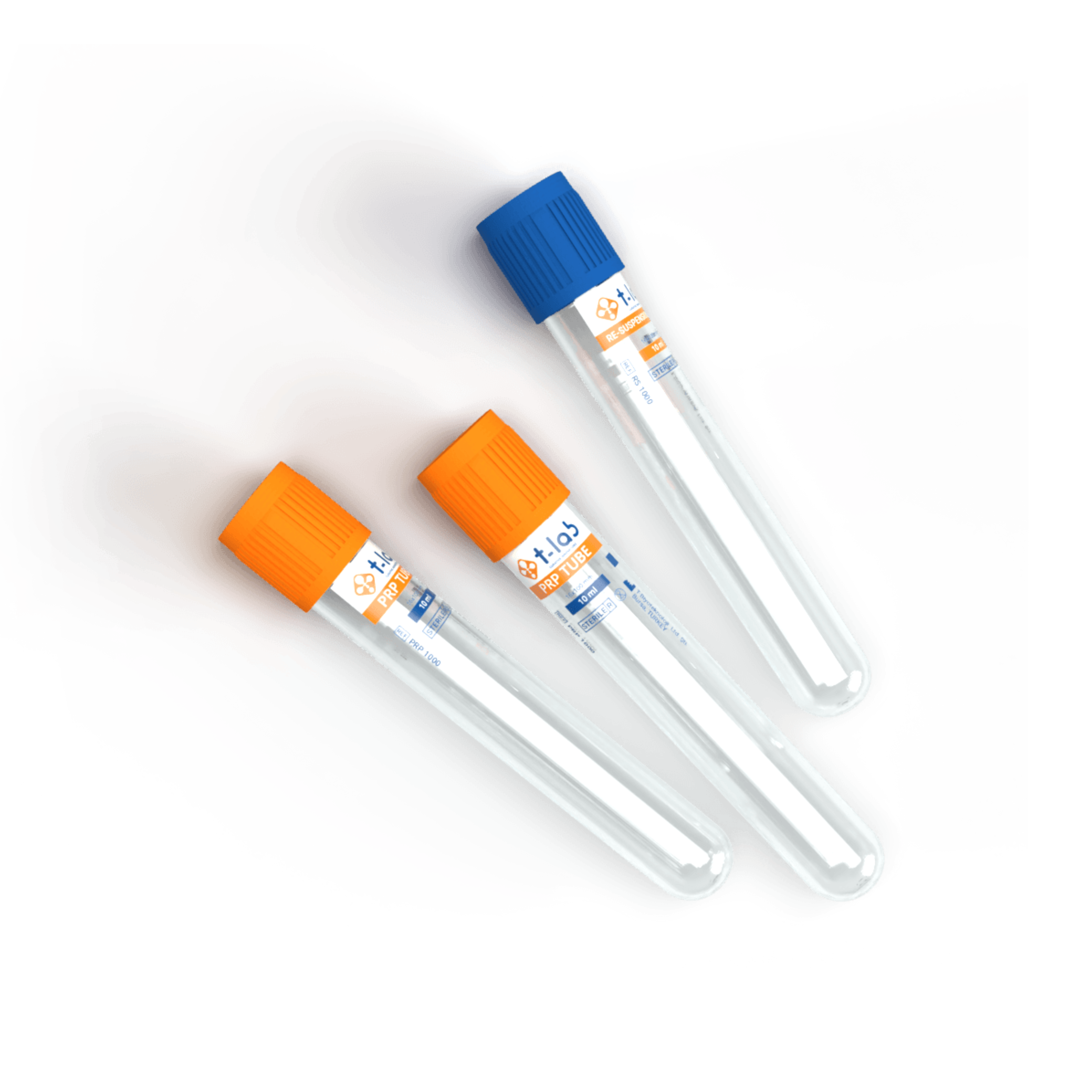 Each T-Lab® PRP Kit contains two micro-polished PRP Tubes (Orange) and a third Resuspension Tube (Blue).